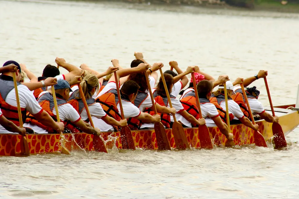 Dragon boating delivers an unforgettable adrenaline rush. Up to 16 people paddle together in long boats, striving for perfect timing and rhythm.